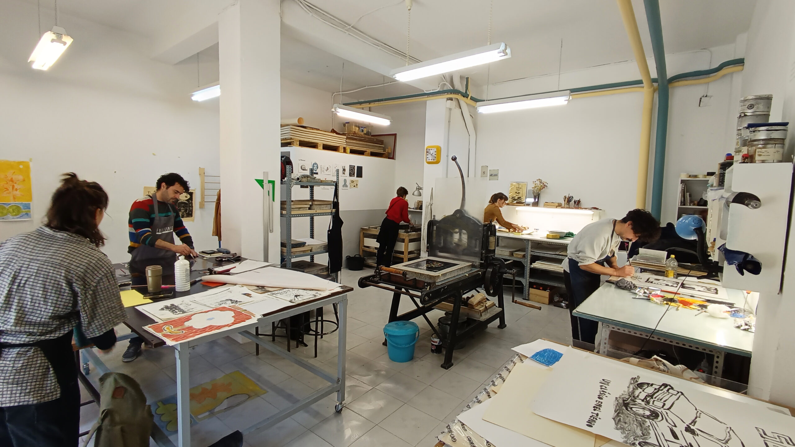 Estas clases se planteas como horas de taller abierto y están pensadas para gente que quiere iniciarse en la técnica poco a poco o para personas con conocimientos previos en litografía que quieren seguir avanzando en la técnica. El planteamiento es ir acompañando a los alumnos en sus procesos creativos y sacar adelante sus proyectos. No se requiere experiencia previa.