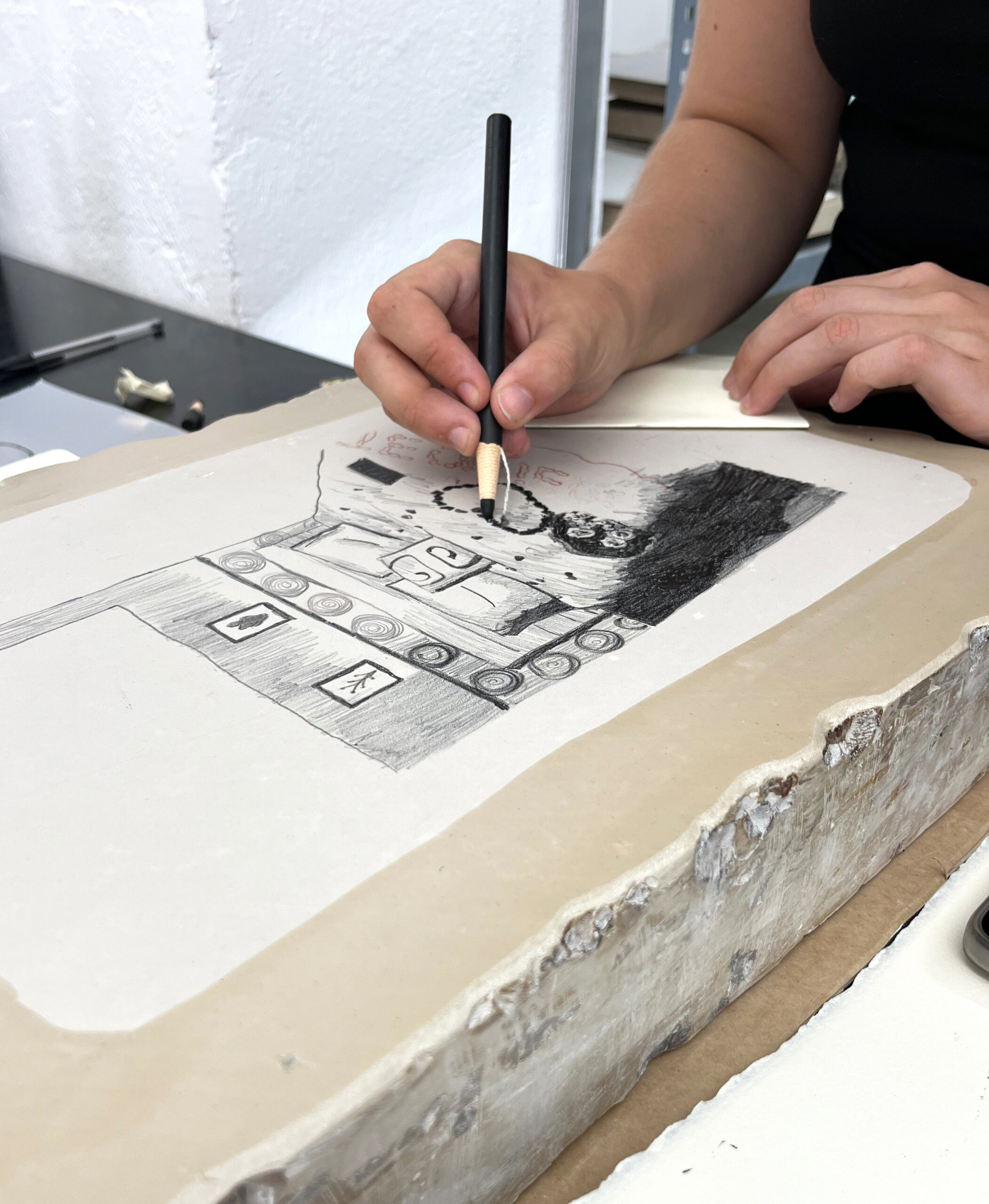 - Estamparemos en un papel de 20x30cm aprox y con una sola tinta.Se pueden traer bocetos o improvisar directamente con los materiales litográficos sobre la piedra.